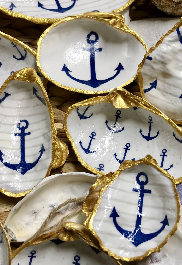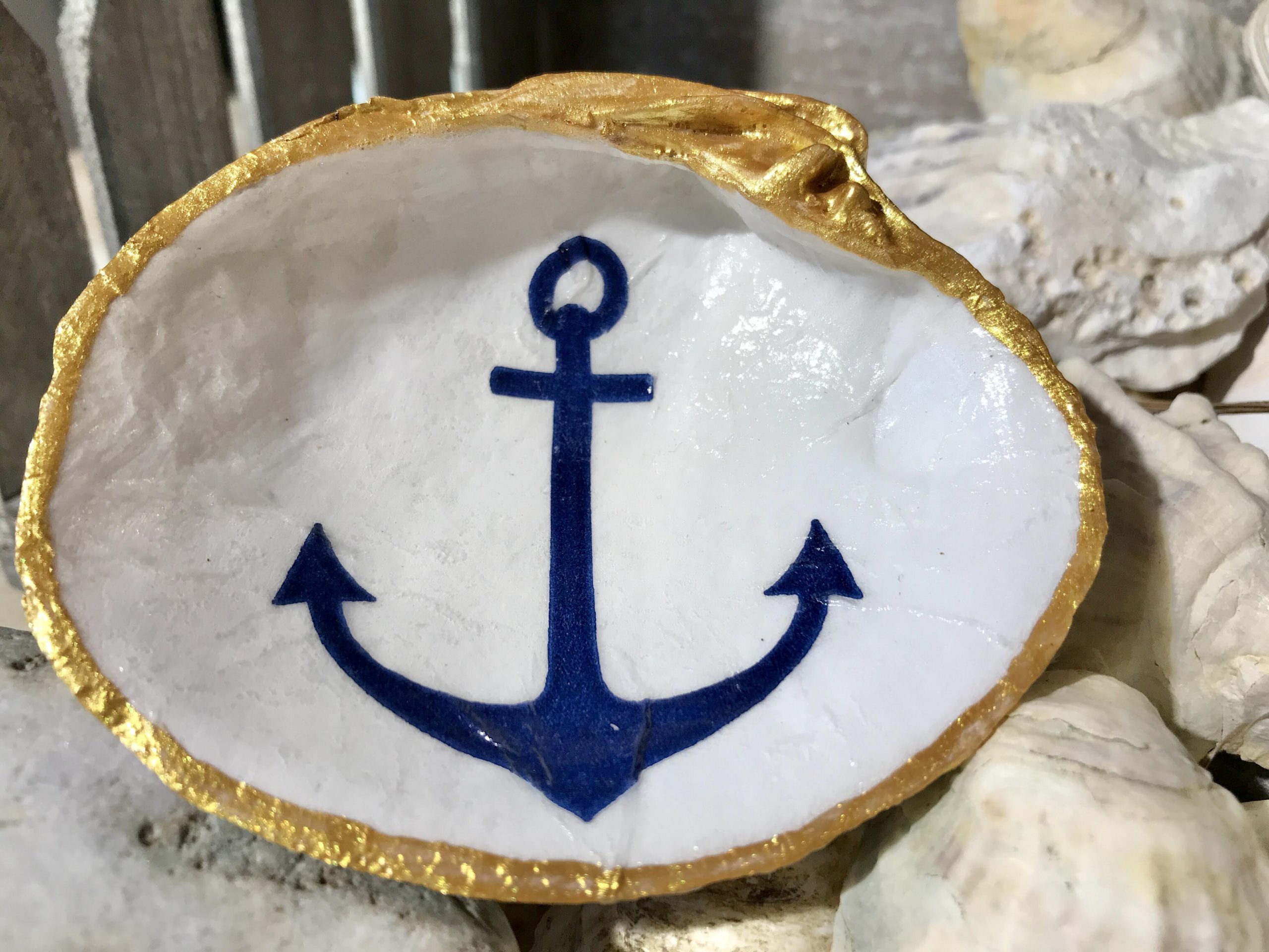 Trinket dishes are decoupaged oyster, clam or mussel shells; pattern displayed on the shell will vary accordingly to the size and shape of the shell. Decoupaged finish is not waterproof.