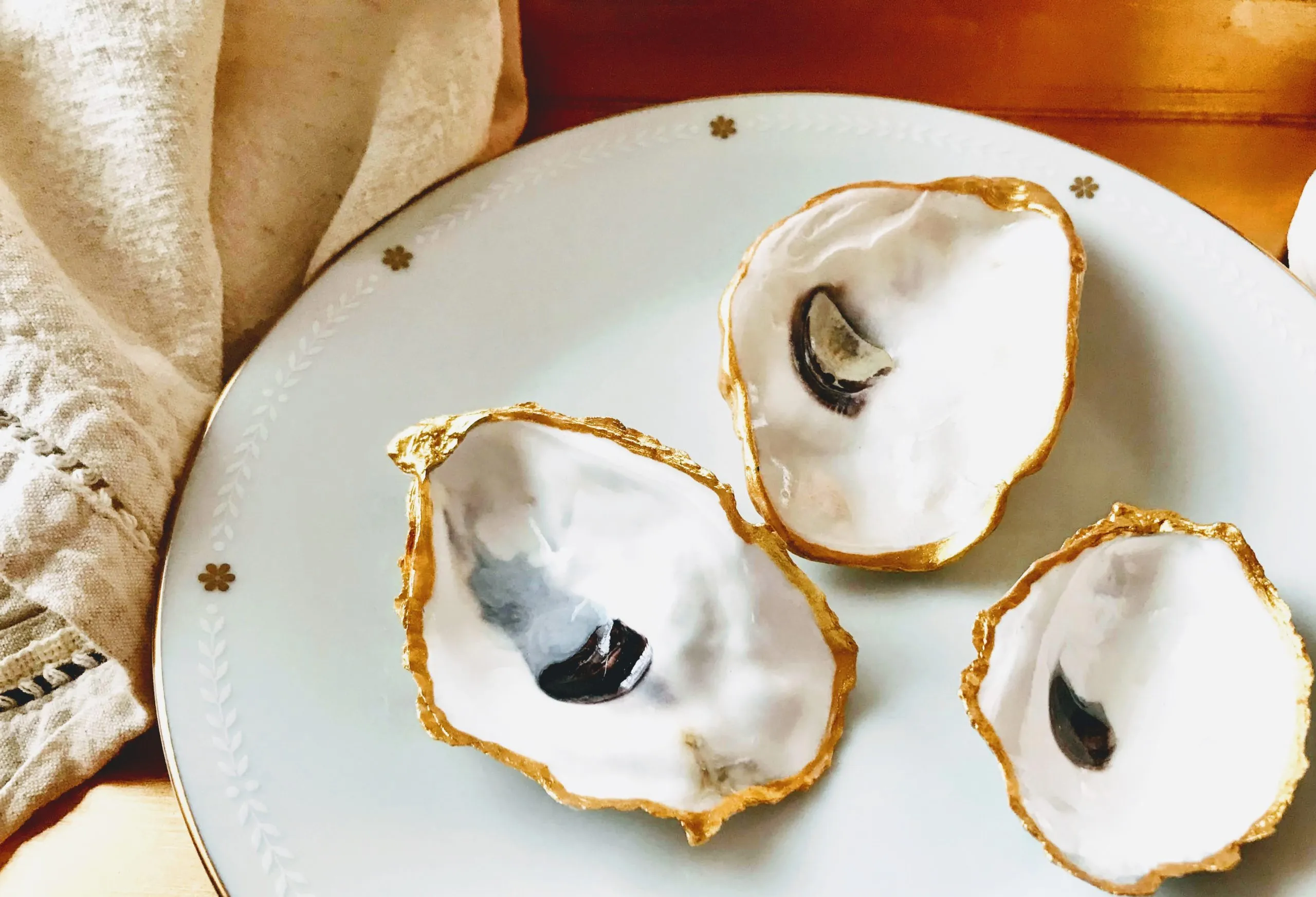 Trinket dishes are decoupaged oyster, clam or mussel shells; pattern displayed on the shell will vary accordingly to the size and shape of the shell. Decoupaged finish is not waterproof.