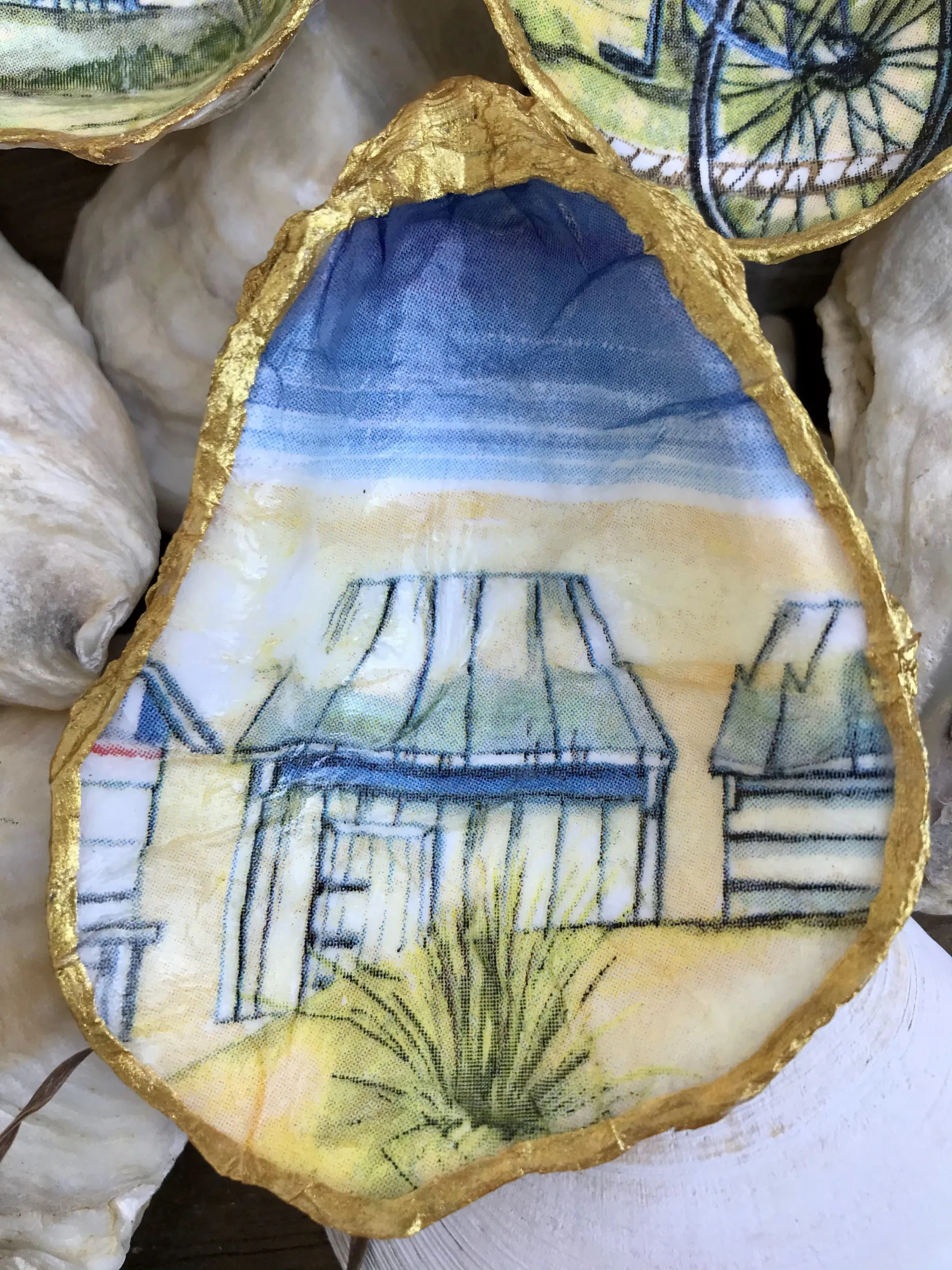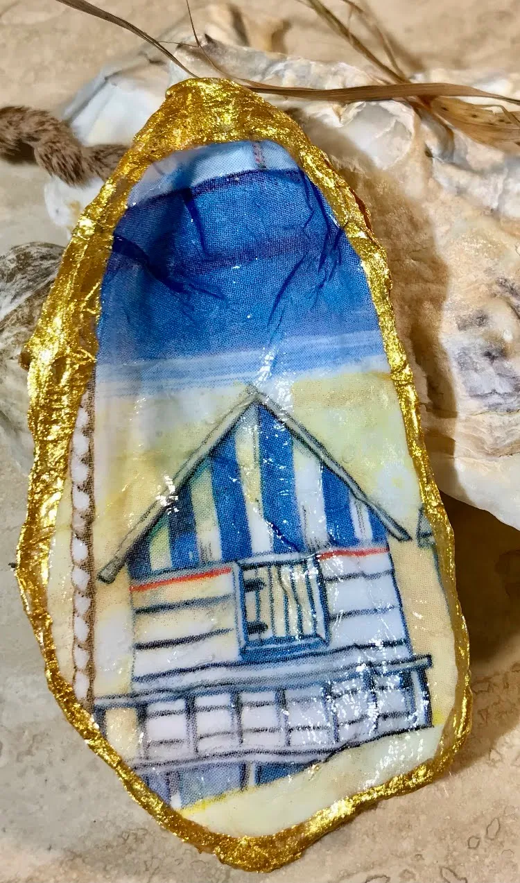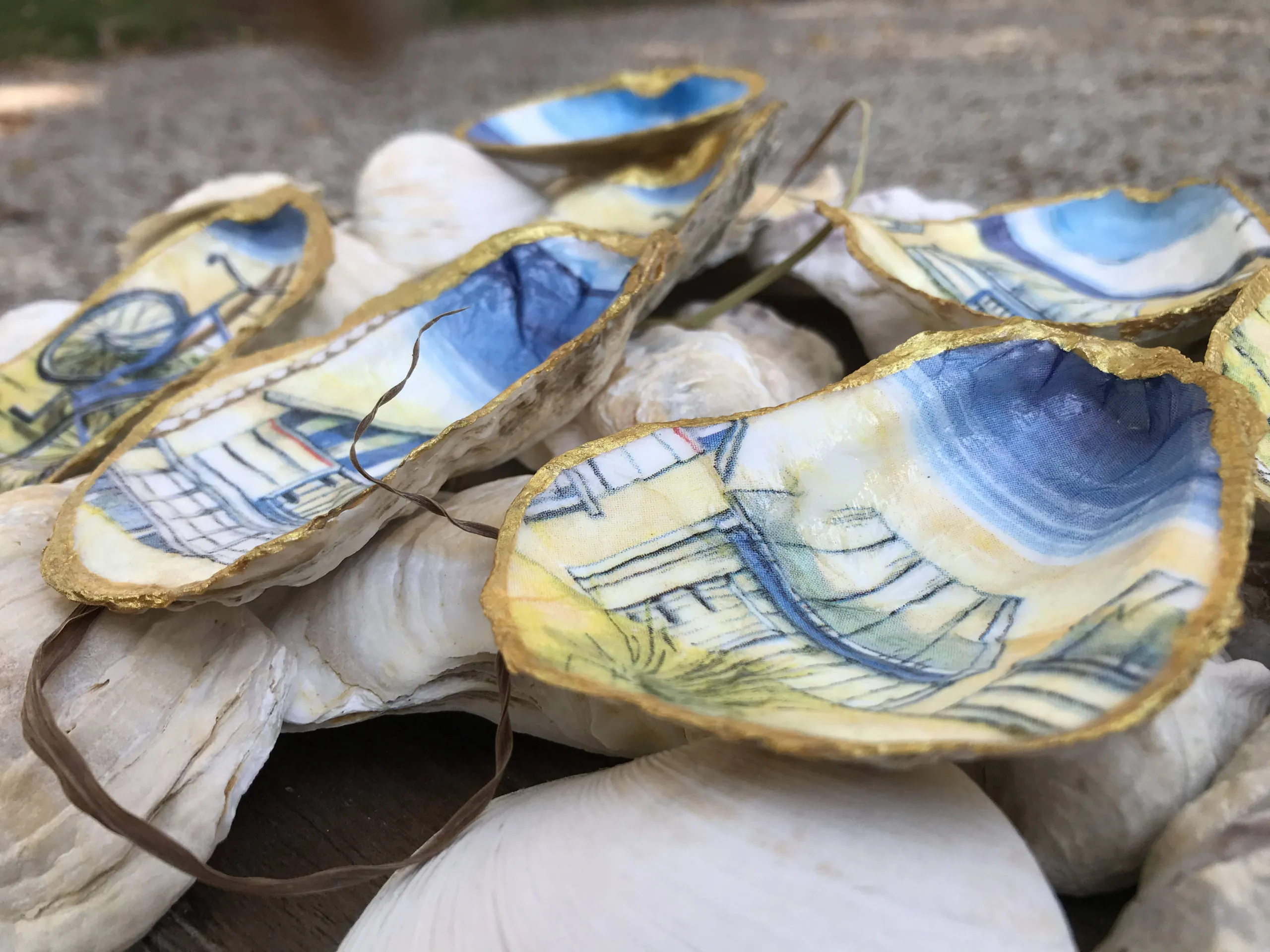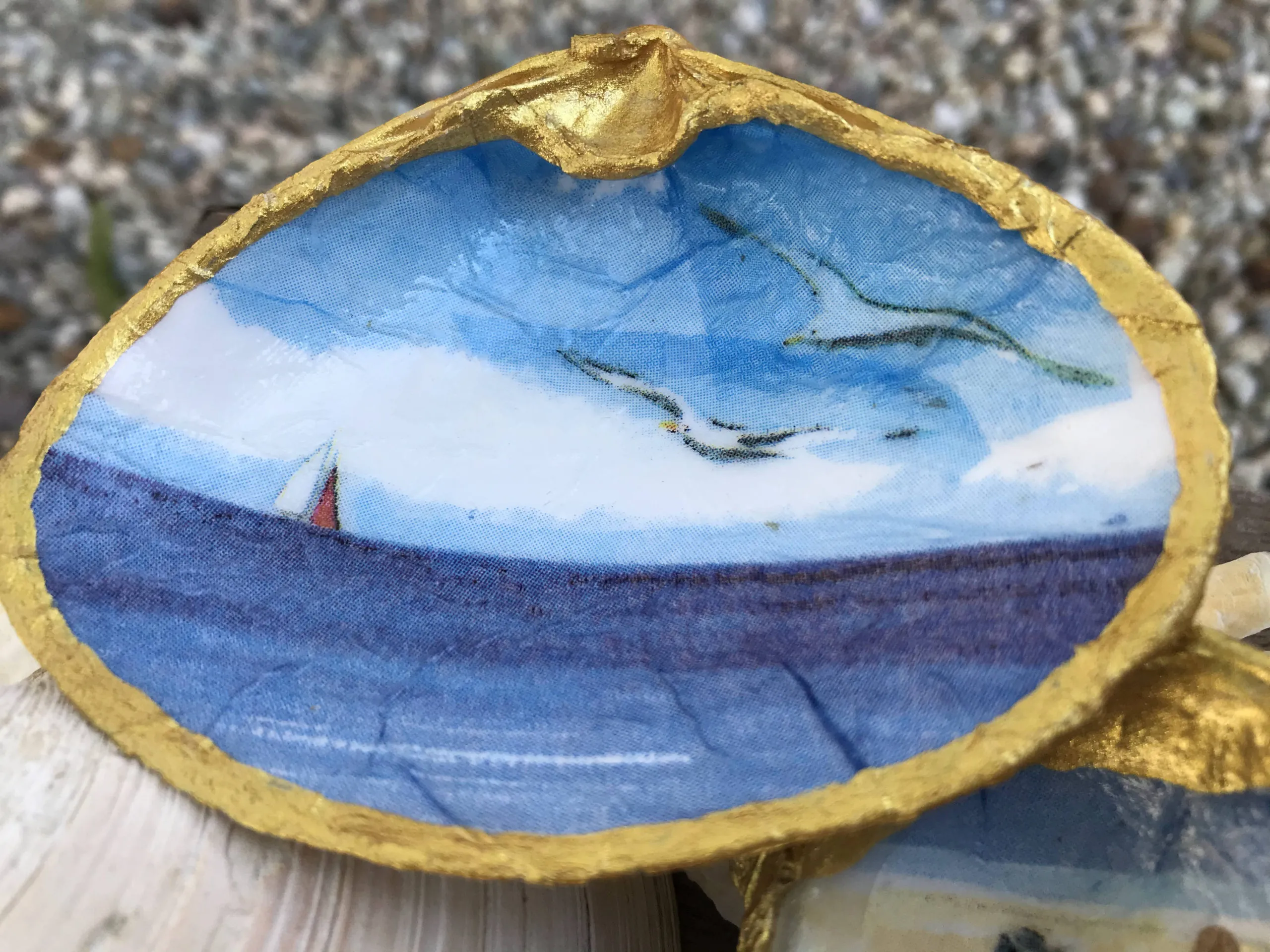 Trinket dishes are decoupaged oyster, clam or mussel shells; pattern displayed on the shell will vary accordingly to the size and shape of the shell. Decoupaged finish is not waterproof.