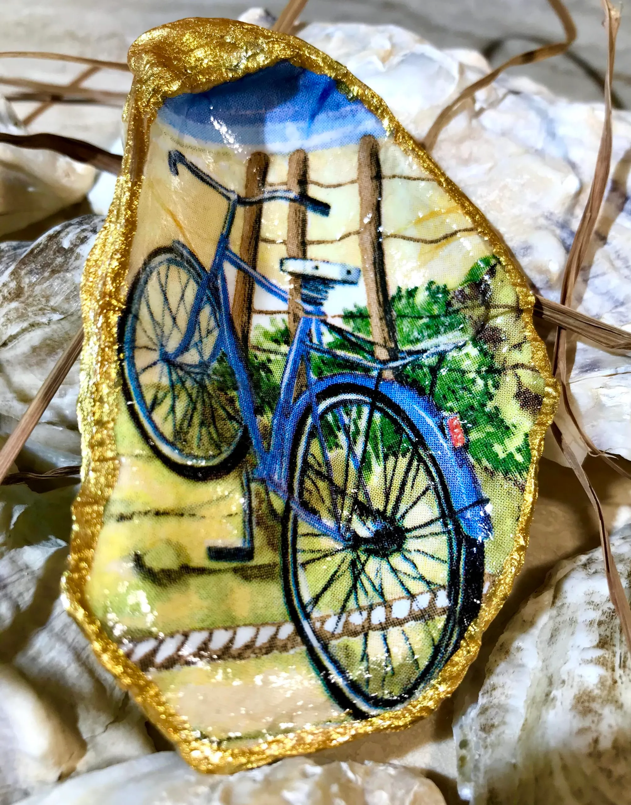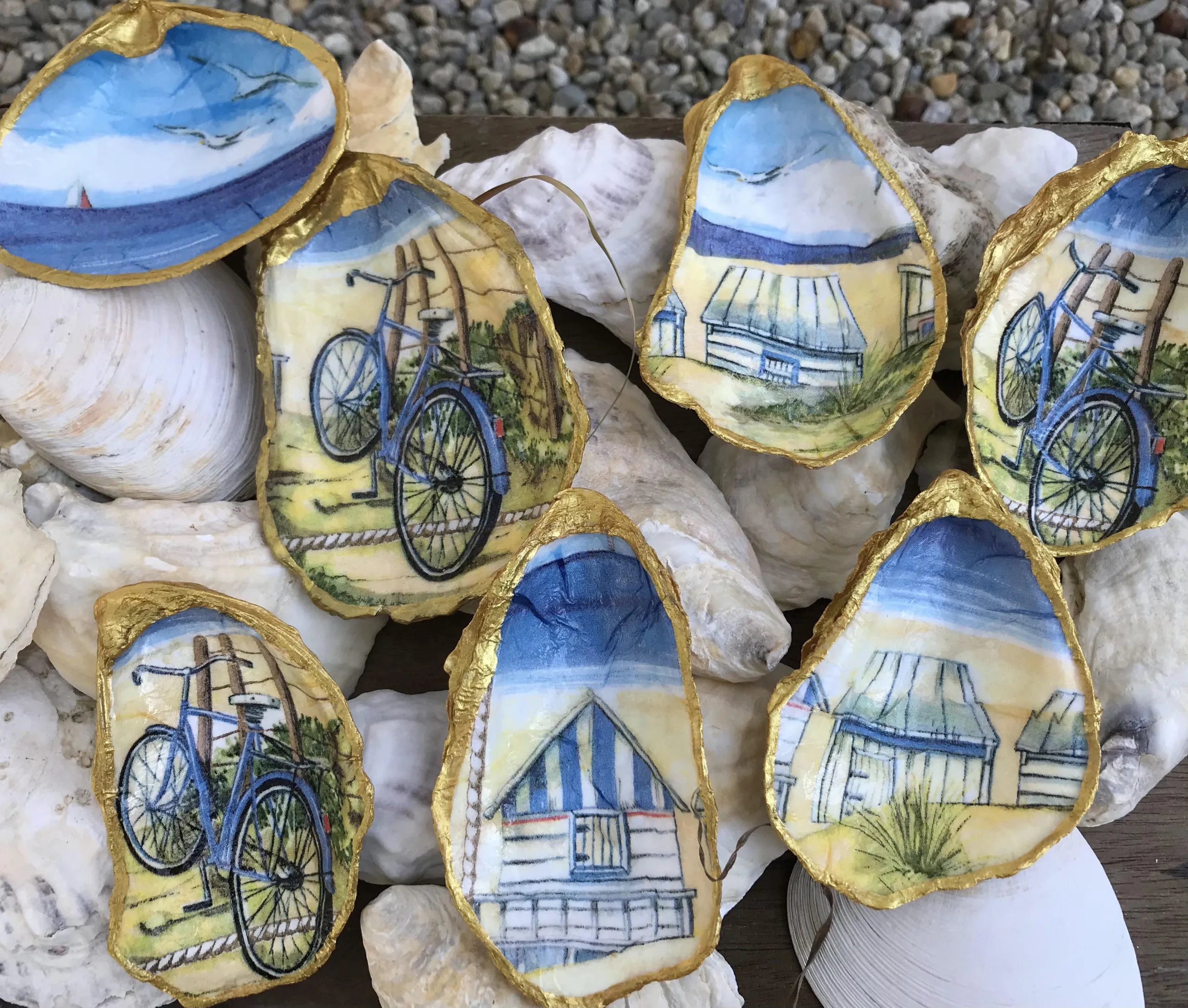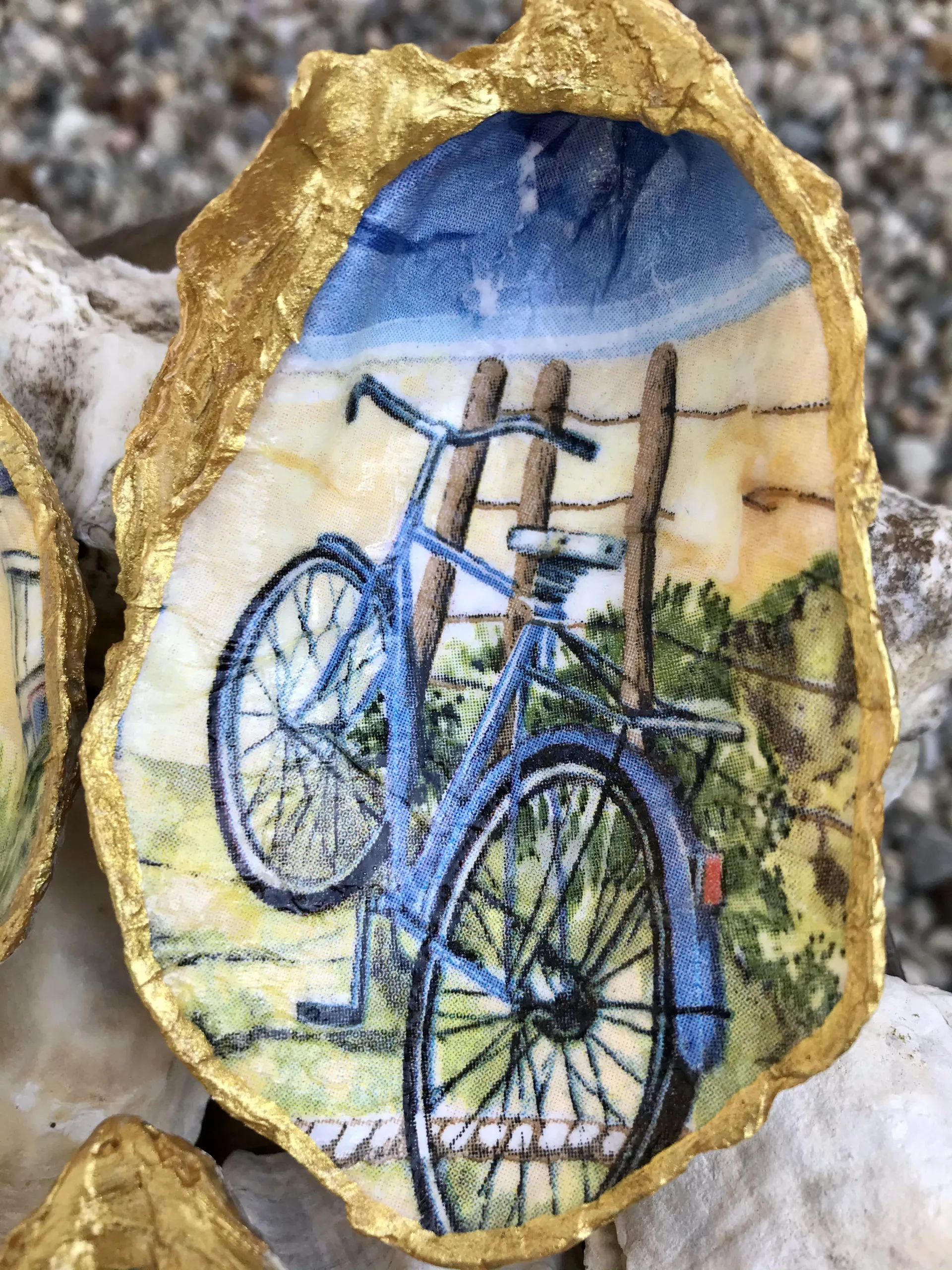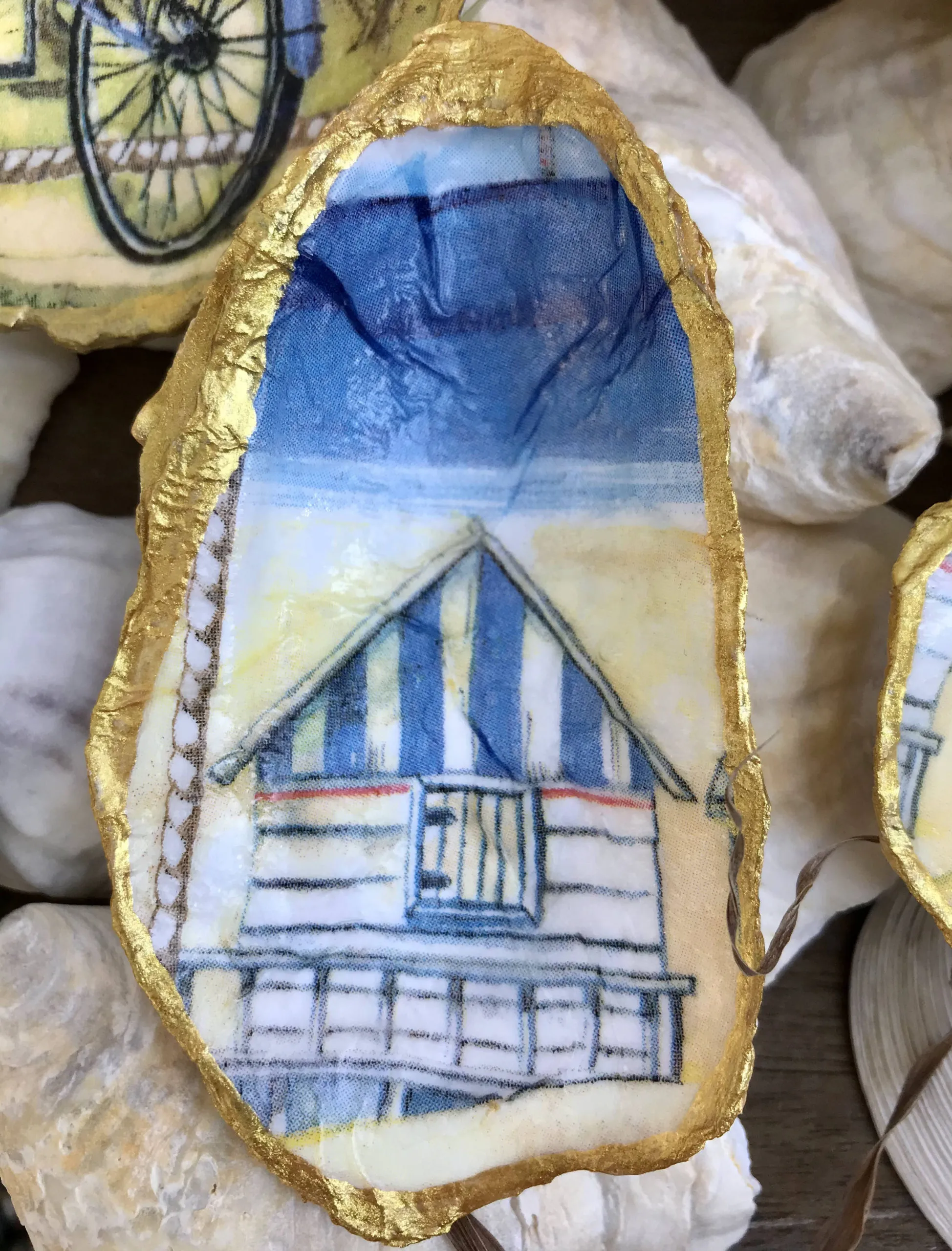 Trinket dishes are decoupaged oyster, clam or mussel shells; pattern displayed on the shell will vary accordingly to the size and shape of the shell. Decoupaged finish is not waterproof.