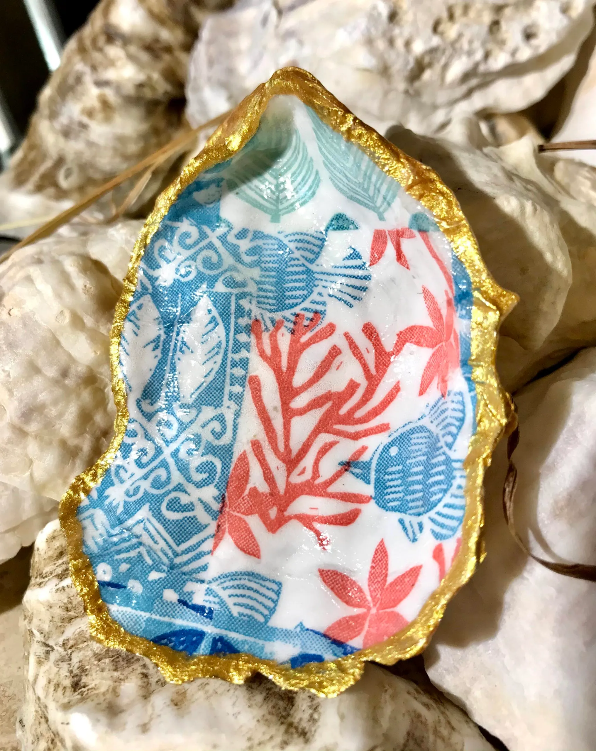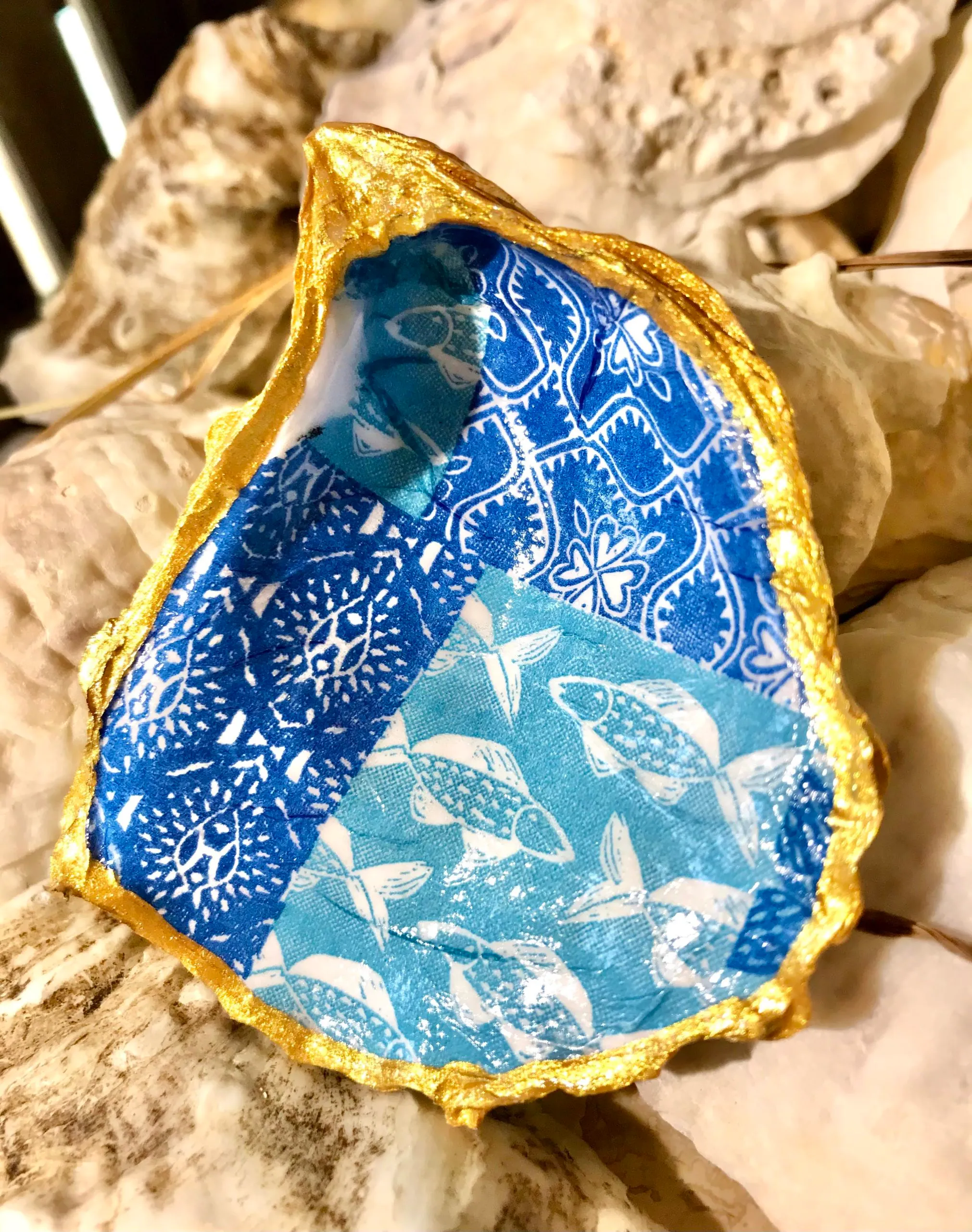Trinket dishes are decoupaged oyster, clam or mussel shells; pattern displayed on the shell will vary accordingly to the size and shape of the shell. Decoupaged finish is not waterproof.
