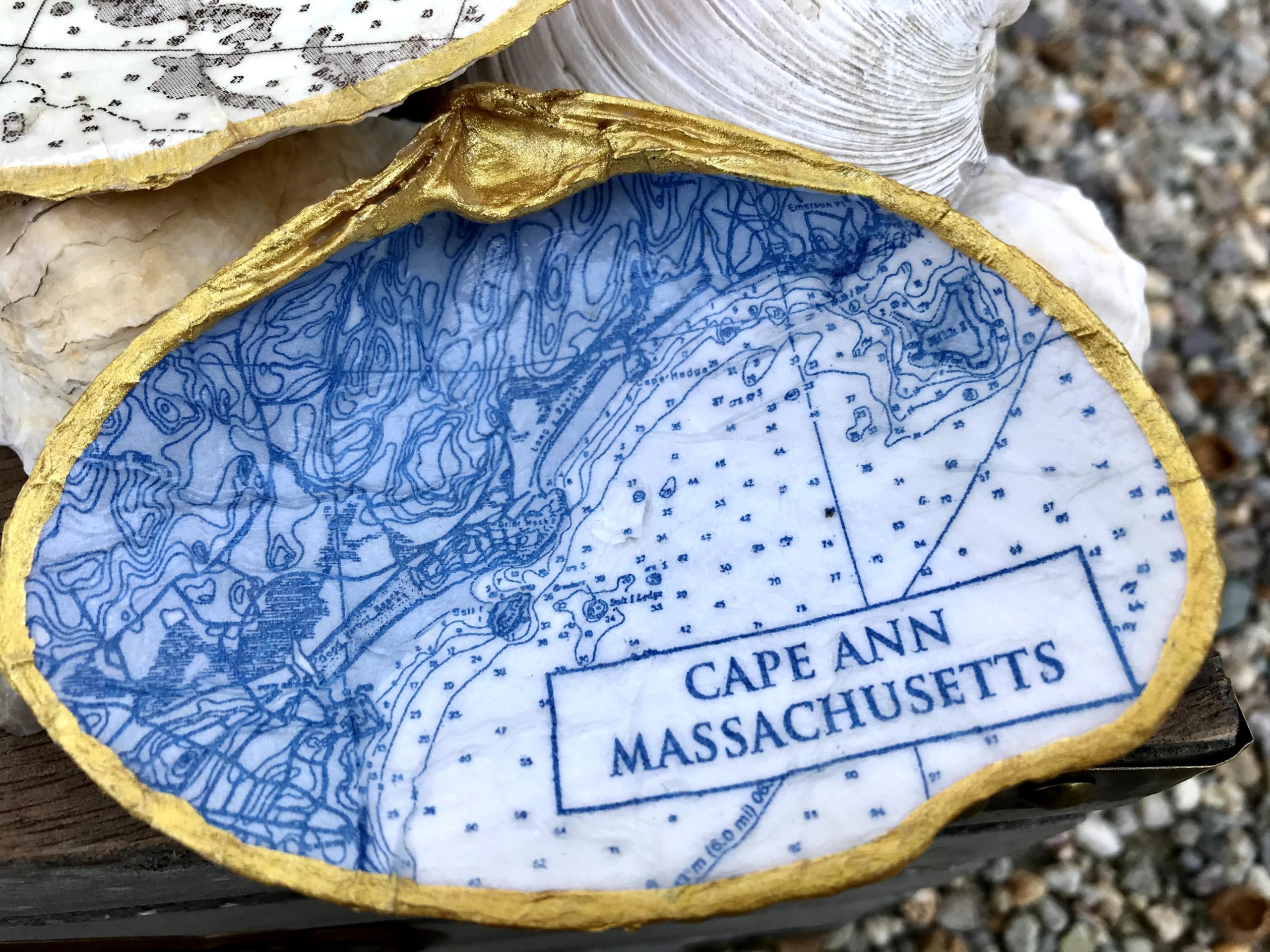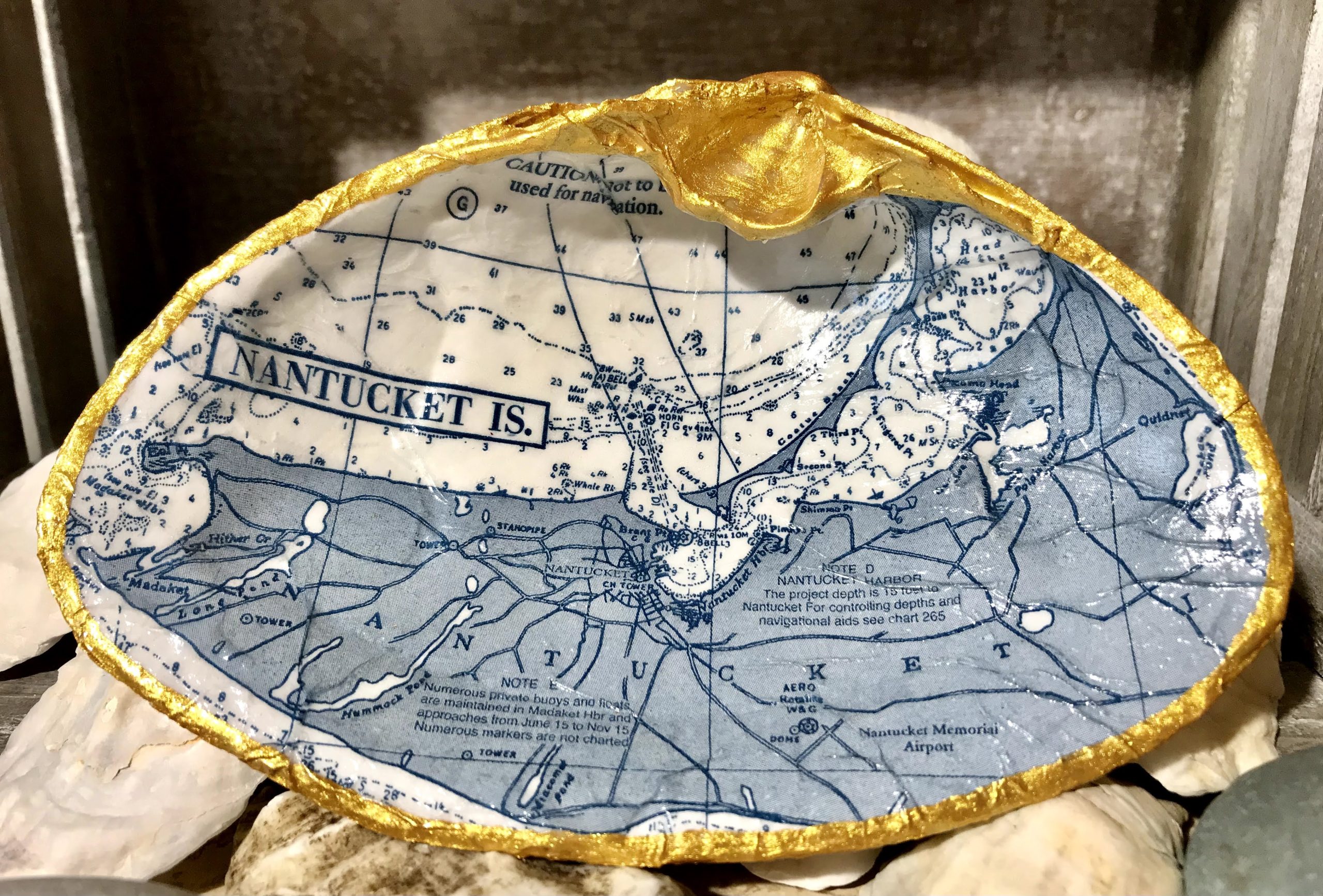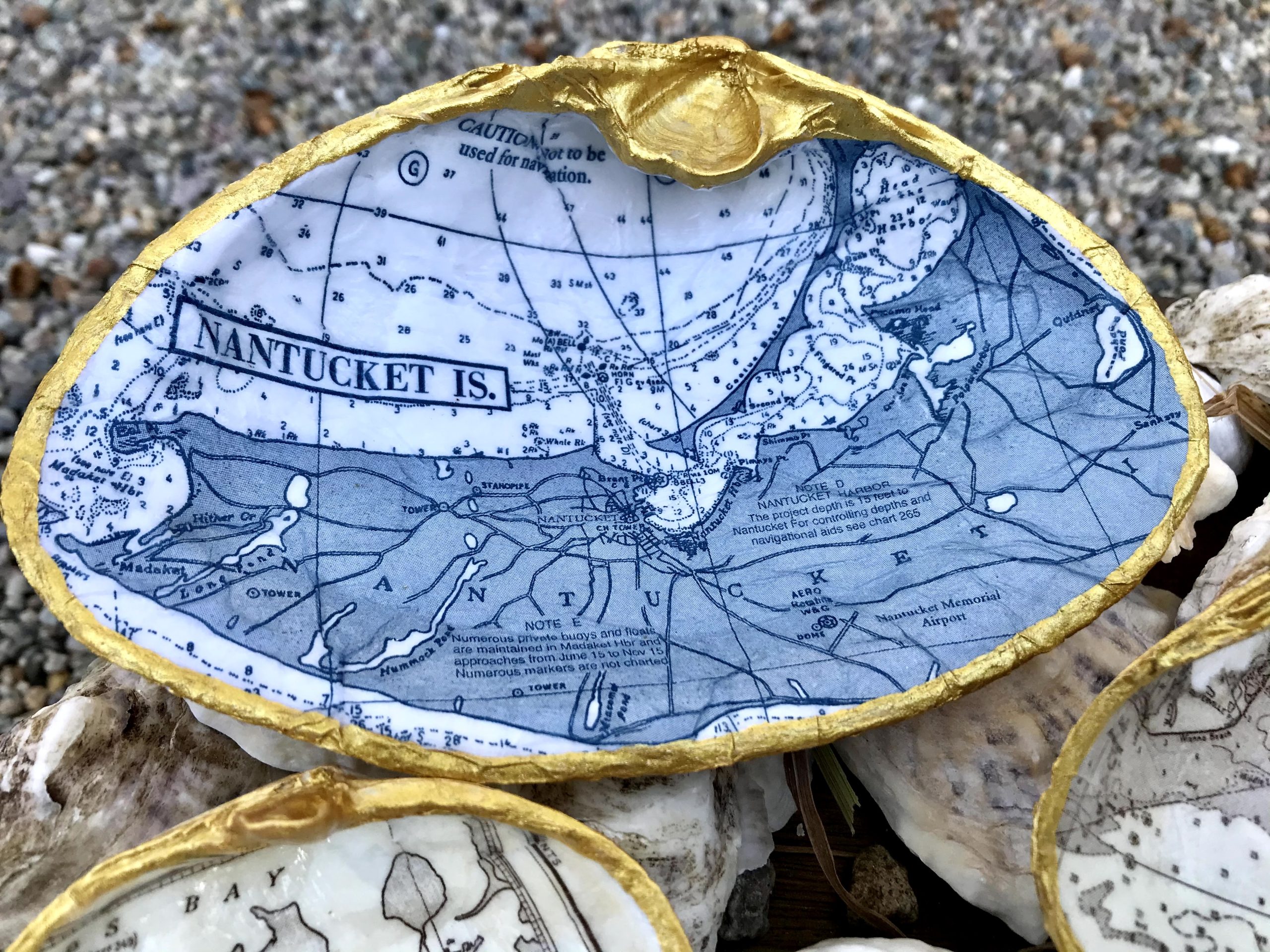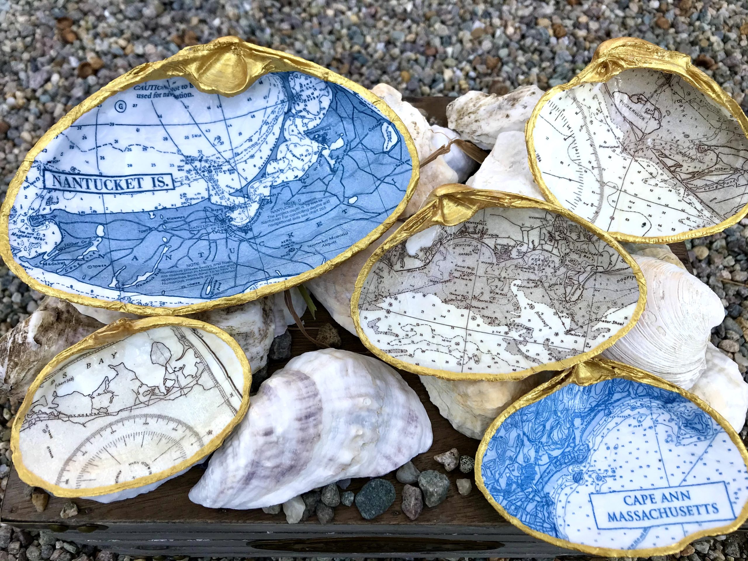 Trinket dishes are decoupaged oyster, clam or mussel shells; pattern displayed on the shell will vary accordingly to the size and shape of the shell. Decoupaged finish is not waterproof.