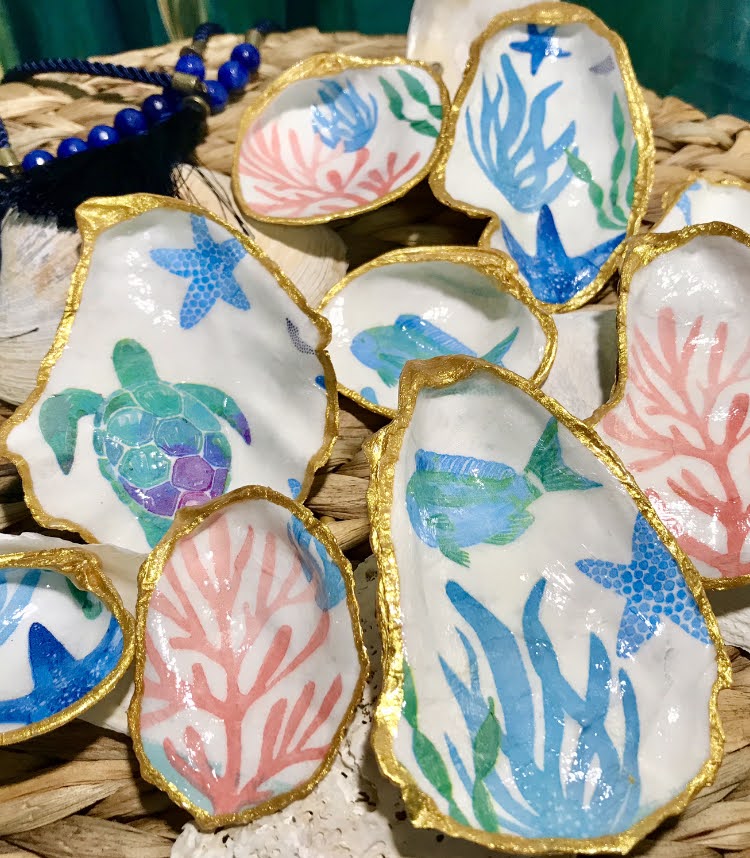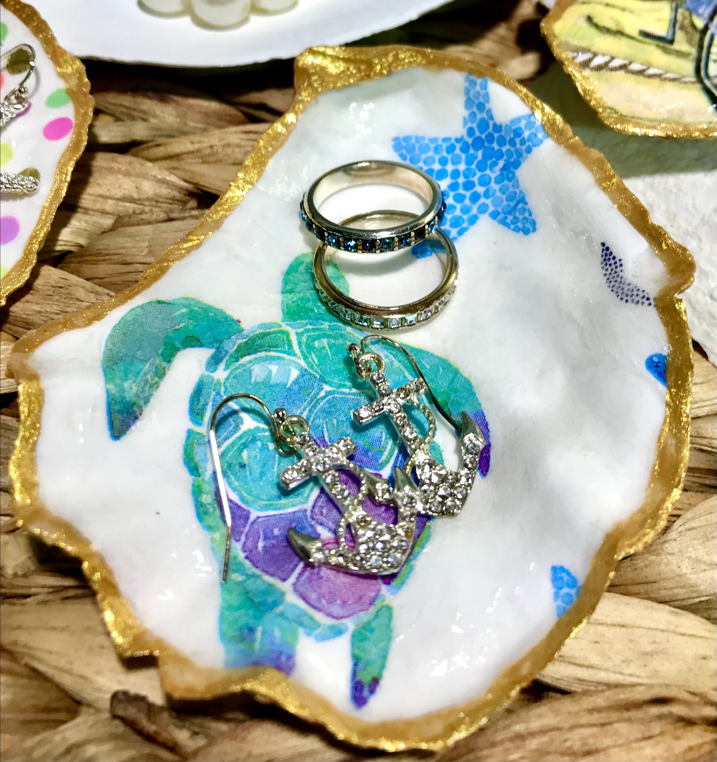 Trinket dishes are decoupaged oyster, clam or mussel shells; pattern displayed on the shell will vary accordingly to the size and shape of the shell. Decoupaged finish is not waterproof.